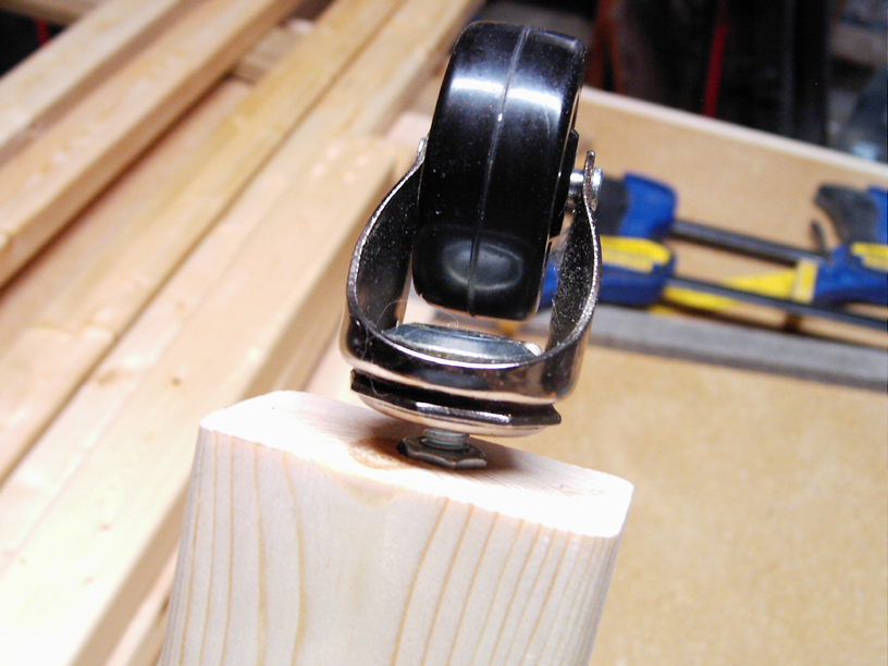 hole. Then, the nut is glued into the socket and an adjustable wheel is threaded into the end of the leg.