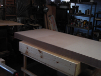 A sheet of 3/4 inch particle board was used as the cabinet work surface. I first bolted it to the cabinet using beveled screw holes